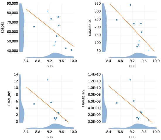 The plot on the left axis combines the kernel density and a regression line (red line) to illustrate the connection between the dependent and independent variables. The kernel density (blue area) portrays the probability distribution of the explanatory variables, while the regression line indicates data trends. This visual representation helps to assess the variable distribution (blue circles) and potential correlations, as indicated by the regression line. The downward trend illustrated in Figure 1 reveals a significant correlation between greenhouse gas emissions and several key factors related to AI investment levels, operational industrial robots, and the presence of the AI industry. As depicted, there is a noticeable decrease in greenhouse gas emissions concurrent with fluctuations in AI investment levels, operational industrial robots, and the presence of the AI industry. This suggests a potential relationship between advancements in AI technology and reductions in greenhouse gas emissions, indicating the potential for AI-driven industries to contribute to environmental sustainability efforts. Further analysis of these trends could provide valuable insights into the impact of AI adoption on environmental outcomes and inform strategic decision-making in policy and industry initiatives aimed at promoting sustainability.
