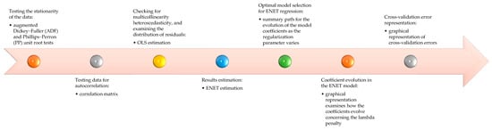 Prior to conducting an Elastic Net regression analysis, it is beneficial and essential to conduct several preliminary tests and analyses to ascertain the adequacy of the data preparation and model readiness. Initial tests will involve assessing the stationarity of the time-series data using the augmented Dickey–Fuller (ADF) [55] and Phillips–Perron (PP) [56] tests. These tests evaluate the null hypothesis that the time-series data possesses as a unit root.