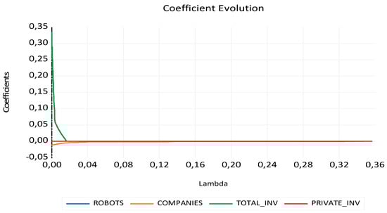 The Elastic Net regularization method was utilized with an alpha value set to 0.5, and the resulting lambda value at the minimum error is 6.839 × 10−05. This lambda value serves as a determinant of the degree of regularization applied to the model, where higher values signify stronger regularization. Additionally, the regressors underwent transformation using the standard deviation of the population. Cross-validation was conducted employing the K-fold method with five folds, incorporating a random number generator with a seed of 930,002,577, facilitating the evaluation of the model’s performance and its generalization ability. The mean squared error served as the selection measure during the cross-validation process, aiming to minimize prediction errors and enhance model accuracy. Regarding the coefficients, for the variable ROBOTS, the coefficient is 4.98 × 10−05, indicating that an increase in the number of robots corresponds to a rise in GHG emissions. Conversely, the coefficient for COMPANIES is −0.011453, suggesting that an increase in the number of companies is associated with a decrease in GHG emissions. TOTAL_INV exhibits a coefficient of 0.331522, indicating a positive relationship with GHG emissions, implying that a higher total investment leads to increased GHG emissions. PRIVATE_INV, however, displays a notably small coefficient (−2.61 × 10−10), suggesting a negligible impact on GHG emissions. Furthermore, the model explains 82.63% of the variance in GHG emissions, signifying a satisfactory fit to the data.