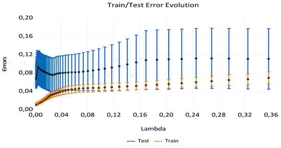 Following this, we introduce a graphical depiction of the cross-validation errors. Figure 4 portrays the lambda path on the x-axis, juxtaposed with the mean error metrics of both the training and test sets on the y-axis. As expected, the training error persistently maintains a lower level than the test error, implying superior model performance on the training data compared to unseen data. This observation aligns with the customary behavior anticipated during model evaluation and validation procedures.