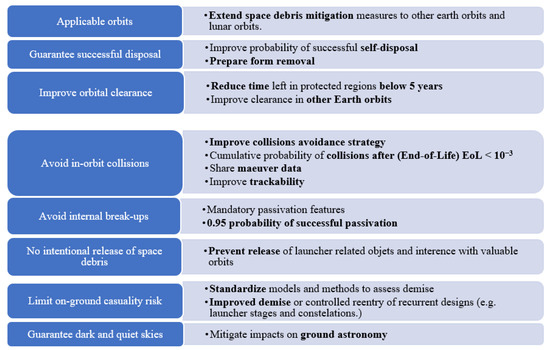 - Space debris mitigation: minimizing the production of space debris;