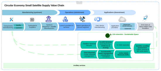 - Life Extension: A novel proposal that takes into account future missions and emerging technologies. This phase involves evaluating satellite health and operational status in orbit. In case of any failure, two options are considered: (1) in-orbit repair through activities such as rendezvous and docking or (2) active debris removal (ADR), which includes the sustainable waste management techniques mentioned earlier. This proposal also addresses a sustainable final disposal system and the potential for reusing materials for other missions.