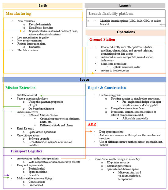 - Transport Logistics: Efficient logistics and transportation systems are important for ensuring the successful launching, deployment, and repositioning of satellites. In Table A1, categorized under “Management and Manufacturing Techniques”, we delve into cutting-edge logistics solutions, including technologies like orbit-reconfigurable satellites, radiation-resistant components, 3D printing, and other innovative approaches. These solutions are purposefully designed to not only reduce the environmental impact of satellite launches but also to optimize satellite placement for maximum efficiency.
