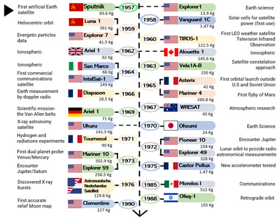 - In 2002, JAXA launched three satellites, two of which were small. The first of these, TSUBASA (MDS-1), was designed to verify the necessary technologies in space based on three keywords: faster operation, lower cost, and increased reliability [119]. The satellite demonstrated primary data collection, allowing scientists to experiment before implementing the payloads in larger satellites. Additionally, the satellite contained complex parts developed by the industry to assess their performance and produce smaller and lighter components at a lower cost. The second satellite was a small research satellite that established small satellite spin bus technologies and offered opportunities for in-space verification [119]. This satellite was unique in the sense that it was “handmade” and was fabricated mainly by young JAXA engineers. The project served as a test case to produce small satellites more efficiently and at a reduced cost.Israel has also explored other types of military small satellites. The Ofeq 5 series was part of the Israeli spy optical surveillance satellites [120]. The first launch of this CubeSat was made on June 20, 2003 [121], in Plesetsk, Russia, on a Eurockot rocket using Russia’s Multiple Mission Orbit Service. The Ofeq series have retrograde orbits due to Israel’s Mediterranean launch path, and they are an upgraded version of the initial Ofeq reconnaissance satellites, which were similar to EROS-A.A group of CubeSats was launched into a sun-synchronous orbit, which included the Danish AAU CubeSat and DTUSat, Japanese XI-IV and CUTE-1, Canadian Can X-1, and Quakesat. The latter used a series of low-frequency ground sensors designed to detect the energy emitted in the LF part of the electromagnetic spectrum before an earthquake occurs [122].