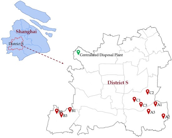 This paper focuses on three agriculture-related towns and nine administrative villages located in District S of Shanghai. Shanghai is a megacity with nine agriculture-related districts, one of which is District S. District S is located in the southeastern region of Shanghai. The locations of the studied area are shown in Figure 1. These towns and villages were selected because they face challenges in wet waste disposal and have unique disposal methods. The typicality of the study object is reflected in the following aspects: