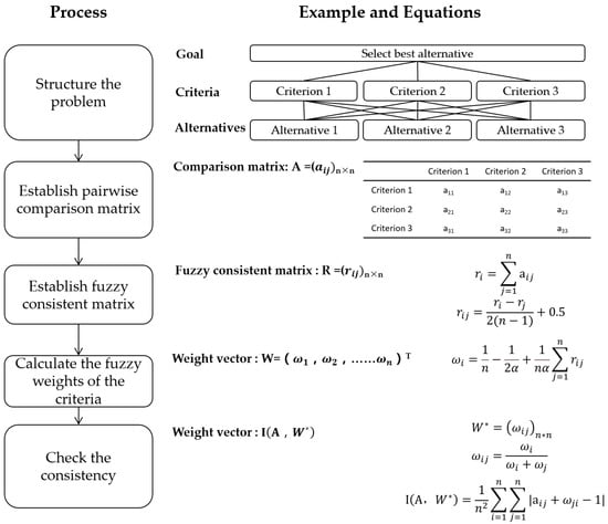 FAHP can better reflect the importance of multiple influencing factors to the decision maker, solve fuzzy and difficult-to-quantify non-deterministic problems in reality, and turn the qualitative evaluation of things into quantitative evaluation. FAHP is a well-established method, the details of which can be found in the literature [47,48,49,50] and are briefly illustrated in Figure 2.
