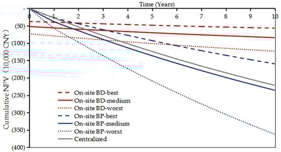 In the short term, the cumulative NPVs of centralized disposal and on-site disposal by small-scale biochemical processors (on-site BP) in the first two years are higher than those of on-site disposal by biogas digesters (on-site BD). This is due to the fact that the construction of a biogas digester requires the village to bear the construction costs by itself. However, in the long run, the annual operating cost of on-site BD is significantly lower than those of the other two disposal modes, with cumulative NPVs of CNY −570.67, −841.80, and −1231.55 thousand in the 10th year under the best, medium, and worst scenarios, respectively. These values for the three scenarios are 0.26, 0.38, and 0.56 times that of the centralized disposal mode, respectively, which is CNY −2217.59 thousand. Even in the worst-case scenario, the cumulative NPV of on-site BD is greater than that of on-site BP in the best-case scenario. For the best, medium, and worst scenarios, the cumulative NPV of the on-site BP mode in the tenth year is CNY −1598.92, −2358.69, and −3626.03 thousand, respectively, with only the best scenario outperforming centralized disposal.