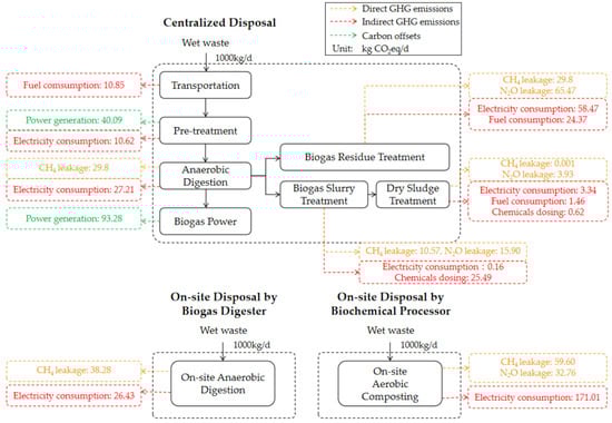 The GHG emissions of the two on-site disposal methods do not consider the utilization or disposal of the fertilizer made from wet waste. If the fertilizer is utilized, it can only be used for gardening or greening, but it lacks compliance and has the risk of polluting the land and salinizing the soil. If the fertilizer is mainly disposed of, for instance, by the incineration of biogas residue, its net GHG emissions will continue to increase.