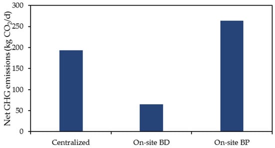 Figure 5 shows the net GHG emissions. The net GHG emissions for the three methods, namely, centralized disposal, on-site BD, and on-site BP, are 193.67, 64.71, and 263.37 kg CO2eq/d, respectively. While centralized disposal can reduce GHG emissions by generating biogas (−93.28 kg CO2eq/d) and reusing biodiesel (−40.09 kg CO2eq/d), the overall GHG emissions are not significantly reduced due to the high electricity consumption of the equipment and the direct emissions of CH4 and N2O. In terms of electricity consumption, the incineration of biogas residue and dry sludge has the highest GHG emissions from electricity consumption (59.05 kg CO2eq/d). In terms of direct emissions, the incineration segment also has the highest carbon equivalent from N2O leakage (69.41 kg CO2eq/d). GHG emissions from on-site BP are dominated by electricity consumption, mainly due to the fact that the technology of this equipment is high-temperature drying and completely non-sewage generating. The main reason for the use of non-sewage generating technology is to comply with high environmental standards. The utilization of this technology leads to high electricity costs and high GHG emissions, reflecting the tightening of environmental control policies that make social costs internal.