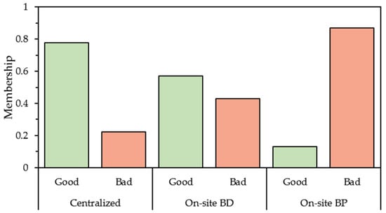 According to the maximum membership principle, the final evaluation results (final memberships) are shown in Figure 6. Centralized disposal is the best among the three modes. The final membership of the centralized disposal mode in the “good” category is 0.75, which means it is moderately good. The main shortcomings of the centralized disposal mode for agriculture-related towns and villages are the high transportation and disposal costs. The main shortcomings of on-site BD (0.57) are the challenges associated with selecting a suitable location and the lack of demonstrated long-term operational stability. On-site BP (0.13) lacks advantages in five key areas: it has the lowest cumulative NPV, the highest net GHG emissions, poor stability, a risk of non-compliance with environmental regulations, and difficulties in location selection.