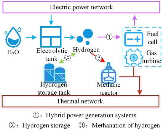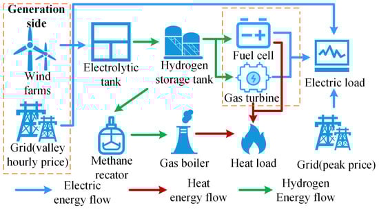 The main structure of the EHT-IES with hydrogen energy systems is shown in Figure 2. The EHT-IES can be divided into three parts: “Electricity”, “Hydrogen”, and “Thermal”.