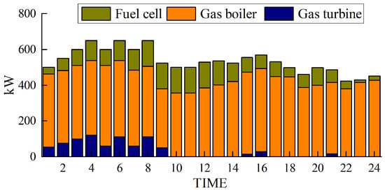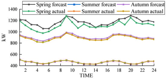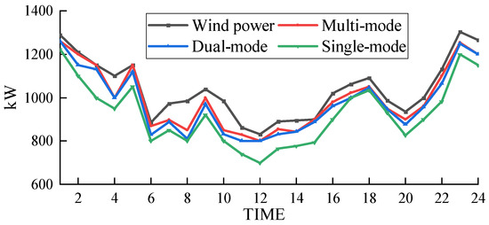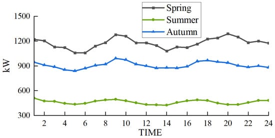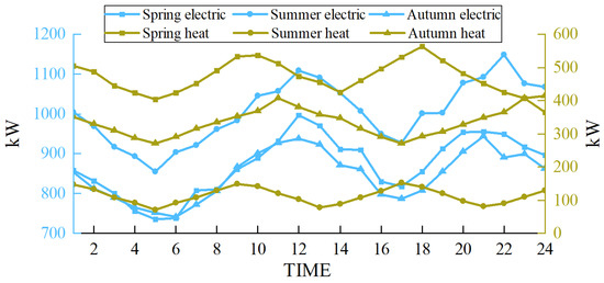 The scenarios selected in this paper are based on the heating season in the northwest region of China. To demonstrate the wide applicability of the proposed multimodal hydrogen utilization model, simulations were conducted for representative days in spring, summer, and autumn, following the methodology outlined in Reference [32]. The wind power forecast outputs and load curves for these three representative days are presented in Figure 12 and Figure 13, respectively.