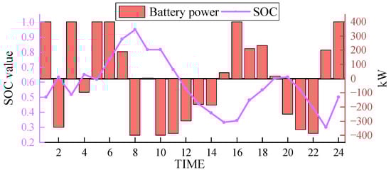 The output of the electrochemical energy storage solution, as depicted in Figure 10 (positive values indicate charging, and negative values indicate discharging), reveals that the lithium-ion battery packs exhibit a substantial output. The average output is close to 300 kW, reaching approximately 400 kW in multiple periods, representing approximately 80% of the full load capacity. The lithium-ion battery packs undergo frequent charge and discharge cycles within the dispatch period, adhering to a typical pattern. However, due to rigid energy storage capacity constraints, the adjustment capability of lithium-ion battery packs is limited, thereby reducing the peak shaving ability and overall energy utilization efficiency.