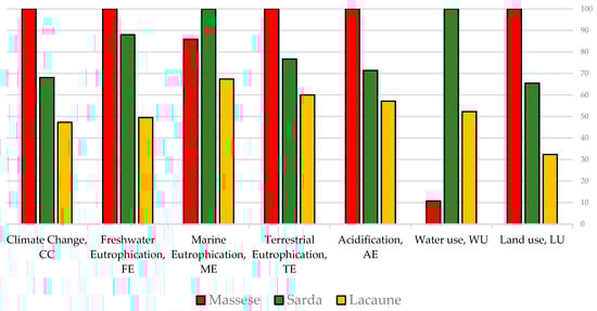The results of the impact assessment of the three farms (Table 5) for most of the impact categories studied showed substantial differences among the farms. The Massese farm is the one that shows the greatest impact scores and Lacaune the least. The exceptions to this are ME and WU, for which the Sarda farm exhibited the greatest impact scores. In general, Lacaune showed impact scores 14% to 48% lower than Sarda, and, with the exception of the WU, 19% to 68% lower than Massese (Figure 1).
