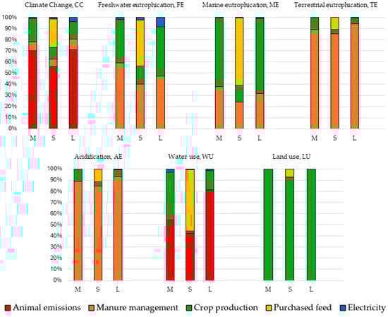Percentage contribution to the impact categories of the main processes of the Massese (M), Sarda (S) and Lacaune (L) farms.