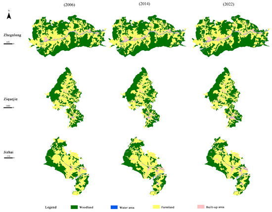 Land use maps of Zhenglong, Ziquejie, and Jizhai Villages in 2006, 2014, and 2022.