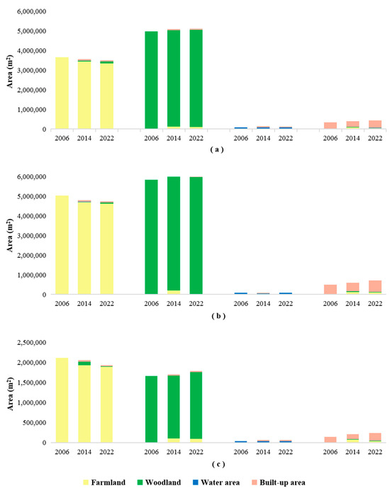 Land use types in 2006, 2014, and 2022. (a) Zhenglong, (b) Ziquejie, (c) Jizhai.