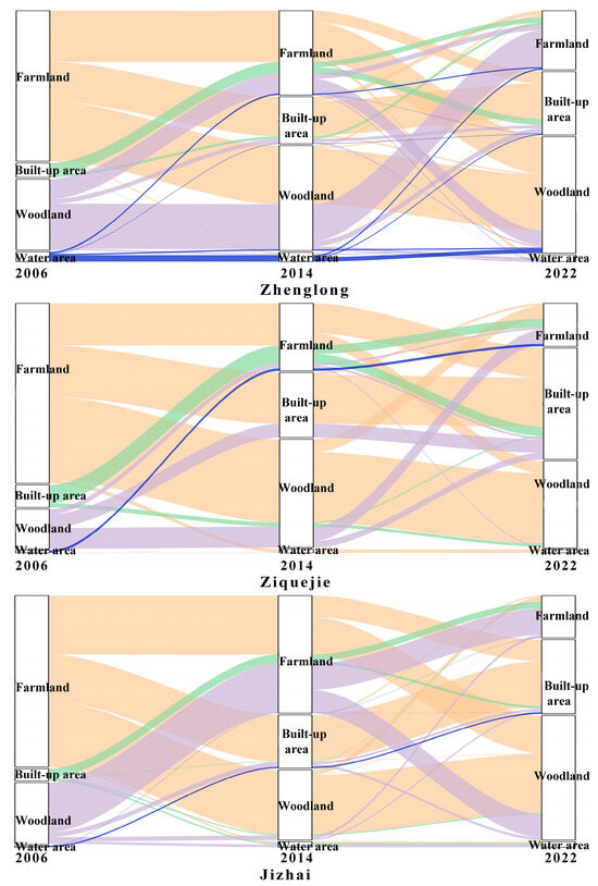 Sankey diagram of land use conversion in Zhenglong, Ziquejie, and Jizhai Villages, 2006–2022.