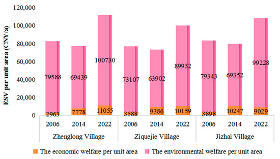 The welfare that villagers obtained from ESs includes direct economic welfare and indirect environmental welfare. Providing primary products and development of tourism, which are two ESs, can directly generate economic value and increase villagers’ income. Together, these factors are called direct economic welfare and can better reflect the utilization of ESV. From 2006 to 2022, the economic welfare per unit area of Zhenglong Village increased by 8092 CNY, which was the largest among the three villages. In terms of time periods, the economic welfare per unit area increased by 4815 CNY from 2006 to 2014. This stage was mainly due to the increase in economic benefits brought about by the provision of primary products. It increased by 3277 CNY from 2014 to 2022. At this stage, with the further establishment of its cultural and tourism integrated model, the increase in tourism income exceeded the provision of primary products and was also the largest among the three villages. From 2006 to 2022, the economic welfare per unit area of Ziquejie Village increased by 6571 CNY. It increased by 5798 CNY from 2006 to 2014 and by 773 CNY from 2014 to 2022. From 2006 to 2022, the economic welfare per unit area of Jizhai Village increased by 5131 CNY, which was the lowest among the three villages. The economic welfare per unit area increased by 6349 CNY from 2006 to 2014 but decreased by 1218 CNY from 2014 to 2022 (Figure 6), mainly due to the increase in price after Ziquejie Tribute Rice was recognized as a Chinese agro-product geographical indications product in 2010, which greatly increased the value of primary products. In the later period, the tourism model was sightseeing type, the tourism projects were relatively simple, and tourism revenue increased less, which is insufficient to compensate for the decrease in the output value of primary products, resulting in a decrease in economic welfare per unit area.