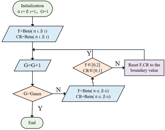 This article introduces a method of dynamically adjusting and ; that is, the dynamic adaptive adjustment method of Beta distribution is introduced to improve the performance of the algorithm. Specifically, the Beta distribution is used to generate random numbers, and then the generated random numbers are mapped to the value ranges of and . Through this dynamic adjustment method, the DE algorithm is able to select appropriate values of and at different stages. In the initial state, we set so that the probability distribution function presents a (0, 1) uniform distribution. During the population evolution process, the parameters and change based on the following Beta probability distribution formula: