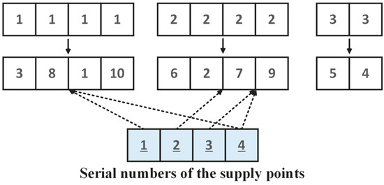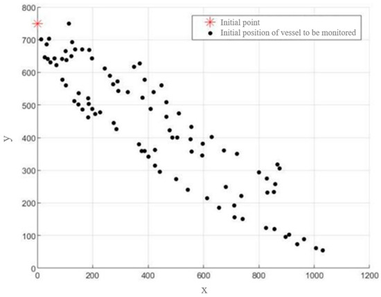 Constraint (2) means that there are UAVs in total that start from the port’s initial point at the same time to monitor the air pollution of vessels in the port sea area. Constraint (3) is the starting route constraint of each UAV, which means that each UAV can only start from the starting point of the port once. Constraint (4) is the constraint that each UAV passes through the last supply point, which means that each UAV can only reach the last supply node once. Constraints (3) and (4) simultaneously constrain each UAV to have only one flight path. Constraint (5) is used to ensure the continuity of the flight path of each UAV; that is, each monitored vessel node has the same degree of entry and exit for its monitoring UAV. Constraint (6) is used to ensure that each monitored vessel can be monitored by a UAV and can only be monitored once. Constraint (7) is the optional supply point constraint and the service sequence constraint provided by the mothership for UAV charging. Constraint (8) is the time window constraint for the mothership to arrive at the supply point m, which is used to ensure that the mothership must arrive at the target supply point to replenish power for the UAV before the UAV’s power is consumed. Constraint (9) is used to determine whether the mothership can reach the target supply node at its maximum speed within the remaining endurance of the UAV. Constraints (10)–(13) are variable constraints, indicating the value range of the decision variable.