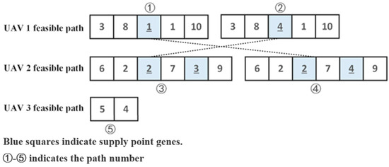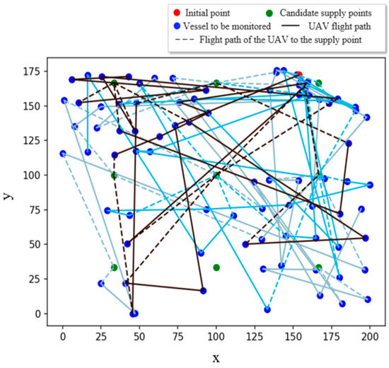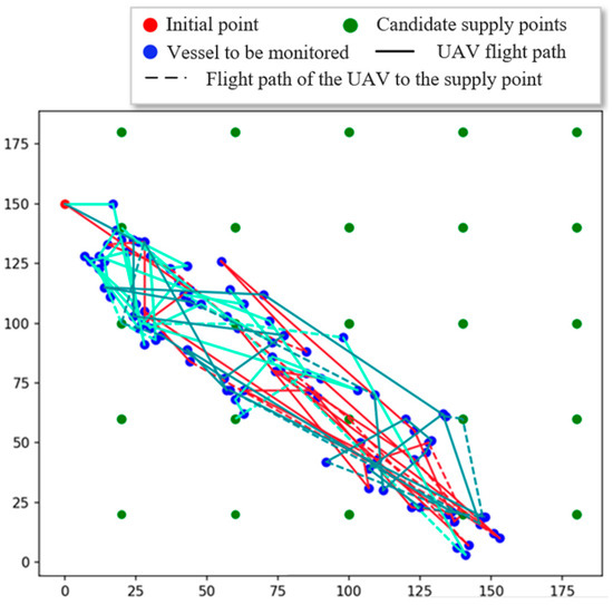 We took the test case data from Shen et al. [12], as shown in Figure 15, and adjusted the parameters to the values in the article, as shown in Table 10. Since the vessel distribution is relatively concentrated, the number of candidate supply points can be increased to improve the efficiency of the algorithm. Since Shen et al. [12] did not consider the UAV charging time, the UAV charging time was set to 0. Bringing the adjusted data into the algorithm of this article, the result is 116.76982 min, which is smaller than the optimal solution of 126.69466 min in the article. The optimization performance of the improved adaptive differential evolution algorithm is further demonstrated. Figure 16 shows the MUCWM path optimization results obtained by using the algorithm of this article to execute the test case data in Shen et al. [12].