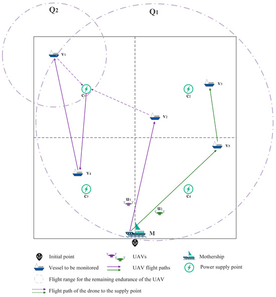 Currently, most of the research on UAV monitoring of air pollution from vessels focuses on the shore-based replenishment method. This method limits the monitoring range of the UAV, and in this mode, the UAV needs to return to shore frequently to recharge, consuming a large amount of electrical energy for the round trip. This reduces the efficiency of energy utilization and increases the time required for the UAV to complete the monitoring task. To address this current problem, Shen et al.’s study [12] explored the use of a ship as a mobile supply station for UAVs. However, the problems not addressed in this study include the following: (1) the possibility of releasing the UAVs prematurely; (2) the charging time of the UAV is not considered; (3) the travel route of the loaded ship is determined at the initial stage, and the paths of the loaded ship and the UAVs are not planned at the same time; and (4) the simulated annealing artificial swarm algorithm, which is designed to be influenced by the initial solution, is highly affected by the initial solution.