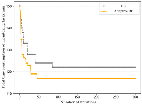When solving the model, in order to verify the superiority of the improved adaptive differential evolution algorithm compared to the traditional differential evolution algorithm, this paper compares the parameters of the adaptive improved differential evolution algorithm with the basic differential evolution algorithm. The group size and the number of iterations are set to = 100 and = 300, respectively. The resulting operation iteration diagram is shown in Figure 13.