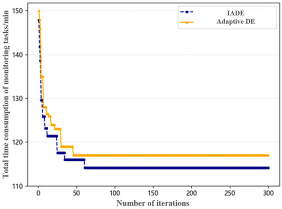 On the basis of the adaptive parameter differential evolution algorithm, after adding the hybrid mutation improvement strategy and the hybrid crossover improvement strategy, the test example is also run when = 100 and = 300, and the resulting convergence diagram is shown in Figure 14. It can be seen from the figure that although the convergence speed has dropped slightly, the improved algorithm has strong search capabilities and performs well in manifesting the optimal solution. Therefore, the overall solution performance of the improved adaptive differential evolution algorithm is higher than that of the adaptive differential evolution algorithm.