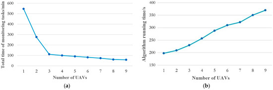 The relationship between the number of UAVs and the optimal solution and the running time of the algorithm: (a) the relationship between the total time of monitoring tasks and the number of UAVs; (b) the relationship between the algorithm running time and the number of UAVs.