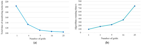 The relationship between the number of grids and the optimal solution and the running time of the algorithm: (a) the relationship between the total time of monitoring tasks and the number of grids; (b) the relationship between the algorithm running time and the number of grids.