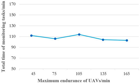 The relationship between the maximum endurance of UAVs and the total time of monitoring tasks.