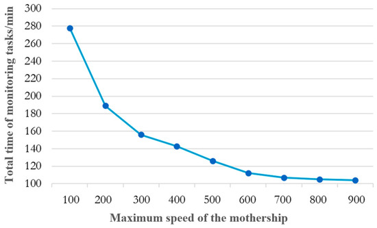 The relationship between the maximum speed of the mothership and the total time of monitoring tasks.