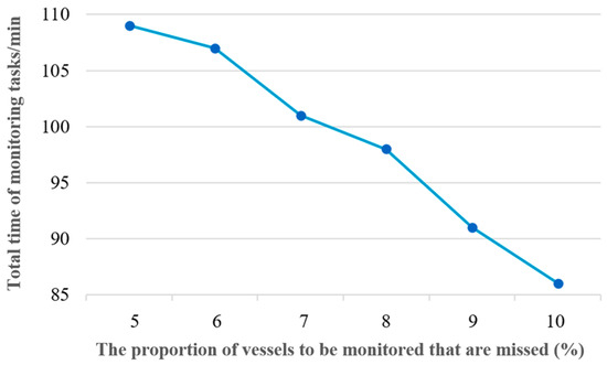 In particular, we discussed the impact on the total monitoring time in the case of leakage of 5–10% of the monitored vessels, and 10 sets of experiments were conducted for each value of leakage, and the results obtained after averaging are shown in Figure 22. From the figure, it can be observed that the total monitoring time tends to decrease as the number of missed vessels increases, and we find that the impact on the total monitoring task is more significant when it is reduced to 10%. This provides a compromise for the port; the port can tradeoff between the time of the total monitoring task and the coverage of the monitored vessels and can choose to give up a small portion of the vessels to obtain a shorter monitoring time, and this analysis provides a certain reference value for the monitoring program of the vessels in the port’s sea area.