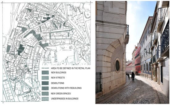 In this sense, it is worth mentioning two examples of rehabilitation plans for historic neighborhoods that have tackled the problem collectively, emphasizing neighborhood retrofitting and the improvement of public space structure and conditions: the Special Plan for Safeguarding Mouraria, Lisbon [] (Figure 1) and the Rive Gauche Rehabilitation Project, Molenbeek, Brussels []. In both cases, the introduction of new collective facilities was a central objective for improving the living conditions of the resident population and their permanence, while pursuing the integration of the new population. The economic revitalization was tackled through the diversification of functions and the protection of traditional uses, promoting new activities housed in newly built buildings. In both plans, the prolonged time of the implementation process allowed for the adjustment between physical transformations and their assimilation by the population, also allowing the evaluation of the effects of each phase.