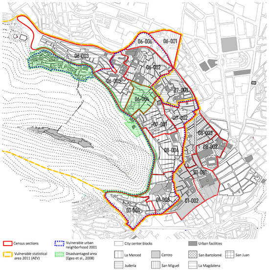 Names and locations of the neighborhoods and census sections of the Barrios Altos of the historic center of Jaén; ‘Vulnerable urban neighborhood’ and ‘Vulnerable statistical area’ according to AEV 23050006, ‘San Juan’ []; limit of ‘Disadvantaged area’ according to Egea []. Source: authors.