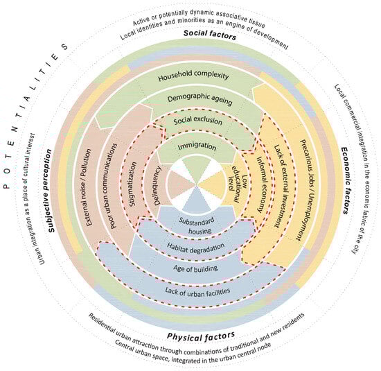 The list of factors used addresses the multidimensional condition of urban vulnerability, endorsed by numerous studies since the beginning of this century that define it as a difficult and disadvantageous situation in an urban area because of all kinds of barriers (economic, social, environmental, and also cultural) []; a situation that is, in addition, a contextual inequality in the city, preventing the integration and participation of members of social groups from that urban environment [] (p. 12).