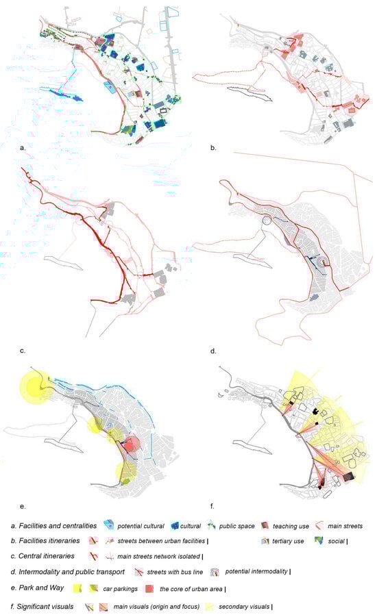 A multidimensional analysis was carried out (Figure 6), identifying the urban structures, identity features, main lines of communication with the rest of the city, and facility locations classified according to types and places with significant views of the territory. After the first diagnostic phase, the existing urban centers, active places and with a social concentration of collective activities and sociability, and notable axes of the urban fabric in these neighborhoods are also identified based on their functionality (Figure 6b,c). Connectivity with the center of Jaén was studied by identifying the intermodal and public transport stops, as well as the articulation between private vehicle parking lots and pedestrian routes (Figure 6d,e).