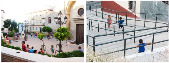The articulator of this strategy is, without a doubt, the public space. Understood in a broad sense, a significant part of the urban identity, and the capacity for social interaction depends on it. In this case, its degradation, and the lack of green spaces and facilities, is observed as one of the main features of the historic neighborhoods of Jaén (Table 2). The sum of the public and private spheres—the public and what we would call its environment—would constitute the ‘social space of the sphere’, in the sociological sense [,,]. In the Barrios Altos, this social space is made up of both the main plazas and the stepped housing access and shared spaces and potential pedestrian streets (Figure 9), and for it to function as a network it must integrate the diversity of types of places, mixing and promoting diverse relationships, social engagement, and appropriation of space.