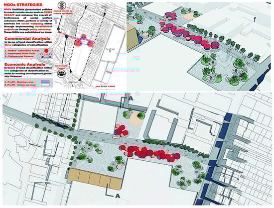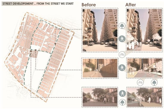 The first proposal is predicated on an institutional vision that seeks to ameliorate the physical landscape of informal settlements by integrating them more cohesively into their broader physical milieu (Figure 5). This vision is operationalized through a targeted intervention within the vicinity of Ezzbit Hegazi, where a comprehensive revitalization of principal thoroughfares is envisaged to forge a robust physical linkage with the area’s extended environment. The envisaged reconfiguration is aimed at equipping these arterial routes with essential infrastructure, thereby enabling them to function as conduits for service delivery to the encompassing region. Integral to this intervention is the strategic deployment of healthcare and educational facilities along these newly enhanced arterial channels, ensuring the provision of vital services directly within the community’s fabric. Additionally, the introduction of vegetation and landscaping features is anticipated to redefine the urban aesthetic, contributing to a transformed urban landscape. This approach is grounded in the conviction that physical enhancements to the environment are intrinsically linked to broader improvements in the quality of life for residents, thereby reflecting a holistic enhancement across various aspects of community life.