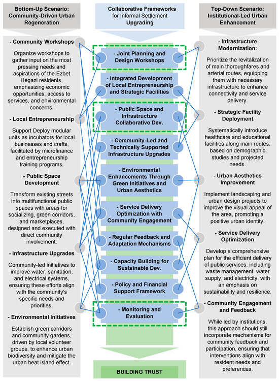 This paper addresses the critical gap in integrating grassroots community engagement with formal institutional support for upgrading informal settlements. Traditional approaches often separate top-down governance from bottom-up initiatives, leading to interventions that are either unsustainable or ineffective. This study bridges that divide by demonstrating how a combined strategy enhances urban regeneration’s effectiveness and sustainability. Existing literature highlights the limitations of using top-down and bottom-up approaches in isolation, where top-down methods overlook local needs and bottom-up approaches lack institutional support [,,,]. By integrating these perspectives, the research provides a comprehensive framework that leverages local dynamics and governmental agendas, offering new insights for policy and practice in urban settings worldwide. This aligns with the need for holistic and inclusive urban development strategies advocated by recent studies on participatory governance and community-led planning [,].