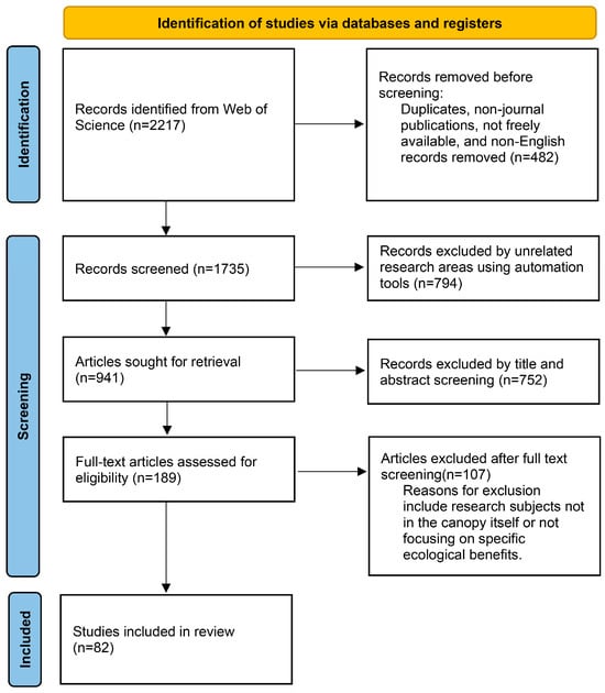 A total of 2217 articles were initially retrieved, and the inclusion and exclusion processes were screened according to the PRISMA process. Duplicates, non-journal publications, articles where the full text is not freely available, and non-English publications were excluded; thus, 482 articles were excluded. Of the remaining 1735 articles, articles whose research area was completely unrelated to this review were excluded, and the remaining 941 articles were excluded. Then, 752 articles were excluded by skimming the titles and abstracts, mostly because of the low relevance and applicability of the research areas to the content of the review. Finally, the remaining articles were further evaluated and screened by reading the full text; of these, 107 articles were excluded, and 82 articles were finally included. The main reasons for exclusion include the fact that the research subject is not on the canopy itself or that the article did not focus on specific ecological benefits.