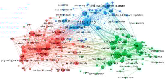 By analyzing the results of the review, it was found that the research content relating to urban canopy cooling benefits is obviously clustered (Figure 2) and is mainly distributed across three research fields: (1) In the fields of urban ecology, urban meteorology, and geographic remote sensing, it is necessary to consider canopy cover at urban and even regional scales and study the cooling effect on the urban heat island and urban green space in combination with the local climate and underlying surface composition of the urban area. (2) Architecture: Landscape architecture studies the cooling effect of street trees in the environment of buildings, streets, residential areas, and other blocks and its specific mechanisms, focusing on the thermal comfort of pedestrians. Keywords such as thermal comfort, street tree, and software simulation often appear in this kind of research. (3) Landscape ecology, botany, and other disciplines often study the relationship between community structures, canopy structures, and even the differences in the physiological traits among individual trees and canopy cooling benefits according to the number and structural characteristics of research objects and research perspectives. It can be seen that the differentiated cluster of research focuses on canopy cooling benefits by discussion at different spatial scales.