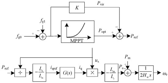 In the process of DFWG virtual inertia response, given that the feedback of the current inner loop significantly exceeds that of the electro-mechanical transient process of the generator, the internal loop of current is identical to the first-order inertial link [19]. The variation of stator flux linkage is disregarded [20], and it is approximately considered to remain unchanged. The change of DFWG electromagnetic power reference value ΔPref is determined by ΔPopt provided by maximum power tracking control and ΔPvir provided by inertia control: