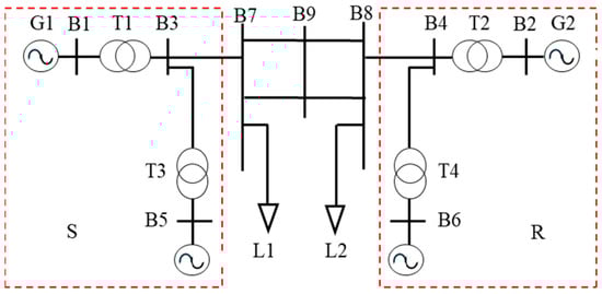 Assuming that the destabilization mode of the system after suffering a large or small disturbance is a two-machine mode, the synchronous machines on both sides of the system are classified into the sender group and the receiver group, according to the direction of power transmission in the contact line; here, G1 is the sender group (S group) and G2 is the receiver group (R group) [21]. The DFWG is directly connected to the grid-connecting buses of the sender group and the receiver group; the model of the two-machine system is shown in Figure 2.