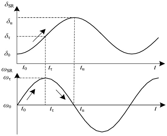After the system experiences a disturbance, there will be oscillations in the angular difference between the two ends [25]. Depending on the direction of the system’s power angle when disturbed, the transient energy of the system is analyzed in two different cases. At that moment , the system’s rotor angle has two types of swings: positive swing and positive swing followed by the negative swing, as shown in Figure 3; at another instance, , the system’s rotor angle has two types of swings: negative swing and negative swing. These are followed by the positive swing, as depicted in Figure 4.