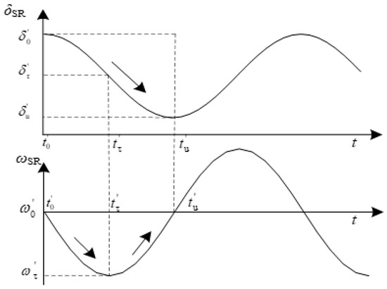 During positive/negative rotor angle swings, in the system acceleration process where ωSR accelerates from ω0 to ωτ; according to Equation (24), if , , the transient energy V′T decreases, enhancing the system frequency stability. Adjusting KS and KR to increase further reduces the transient energy VT, thereby further enhancing the system frequency stability. Conversely, the system frequency stability weakens.