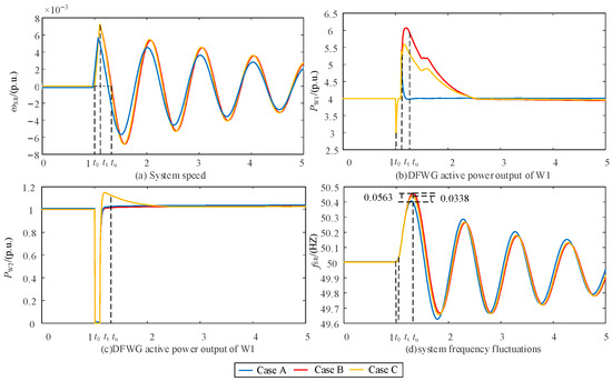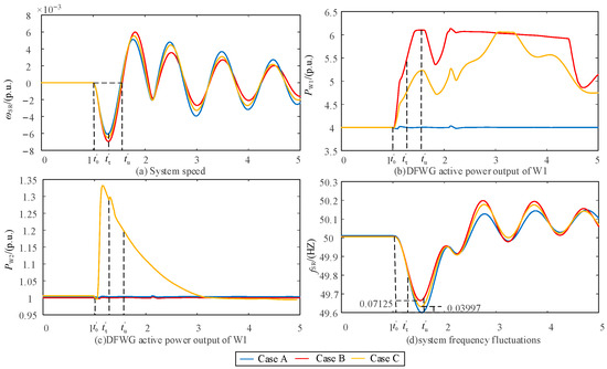In comparison to Case A, in Cases B and C, the proportional coefficient of the DFWG equivalent inertia control is . In , the system speed ωSR accelerates from ω′0 reverse to ω′τ, and the DFWG provides transient energy.