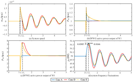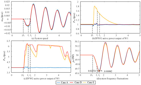 Compared with Case A, in Case D and Case E, the DFWG equivalent inertia control coefficient is . In , the system speed ωSR accelerates from ω′0 reverse to ω′τ, during this, the DFWG supplies transient energy is .