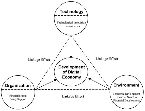At the environmental level, the level of economic development provides environmental guarantees for the healthy development of the digital economy []. Economically developed regions possess superior resource endowments, well-developed infrastructure, and a concentration of innovative talents, resulting in strong backup for innovative development. Additionally, the development of the digital economy is closely related to the level of industrial structure. As traditional industries evolve from labor-intensive to capital-intensive, technology-intensive, and knowledge-intensive industries, the digital economy will experience rapid growth. The deep integration of the digital economy with industries will also drive the upgrading of industrial structures []. The research framework is illustrated in Figure 1.